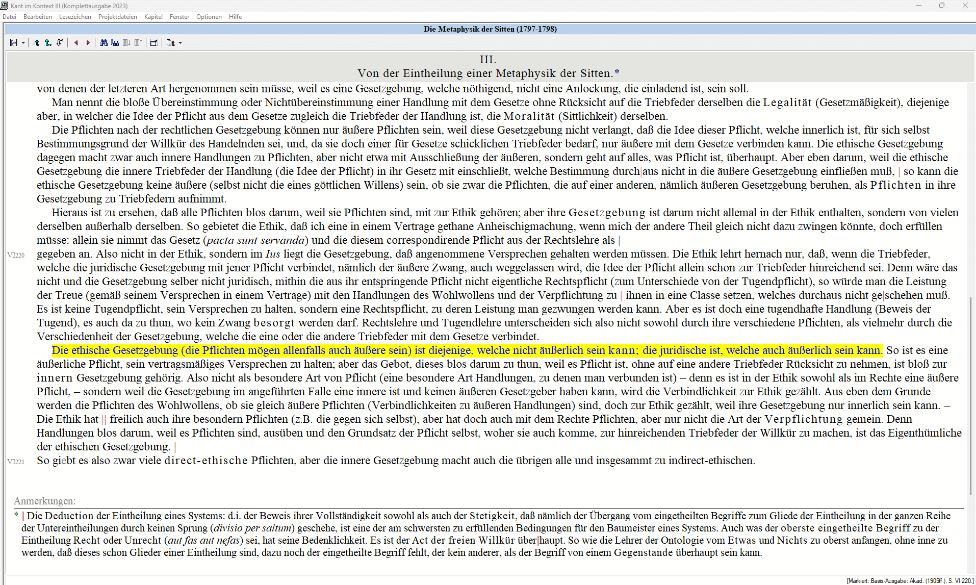 Kant skriver: "Etisk lovgivning (selvom pligterne kan være udvendige) er den, der ikke kan være udvendig; juridisk lovgivning er den, der også kan være udvendig." (Text)/(AA VI:220)